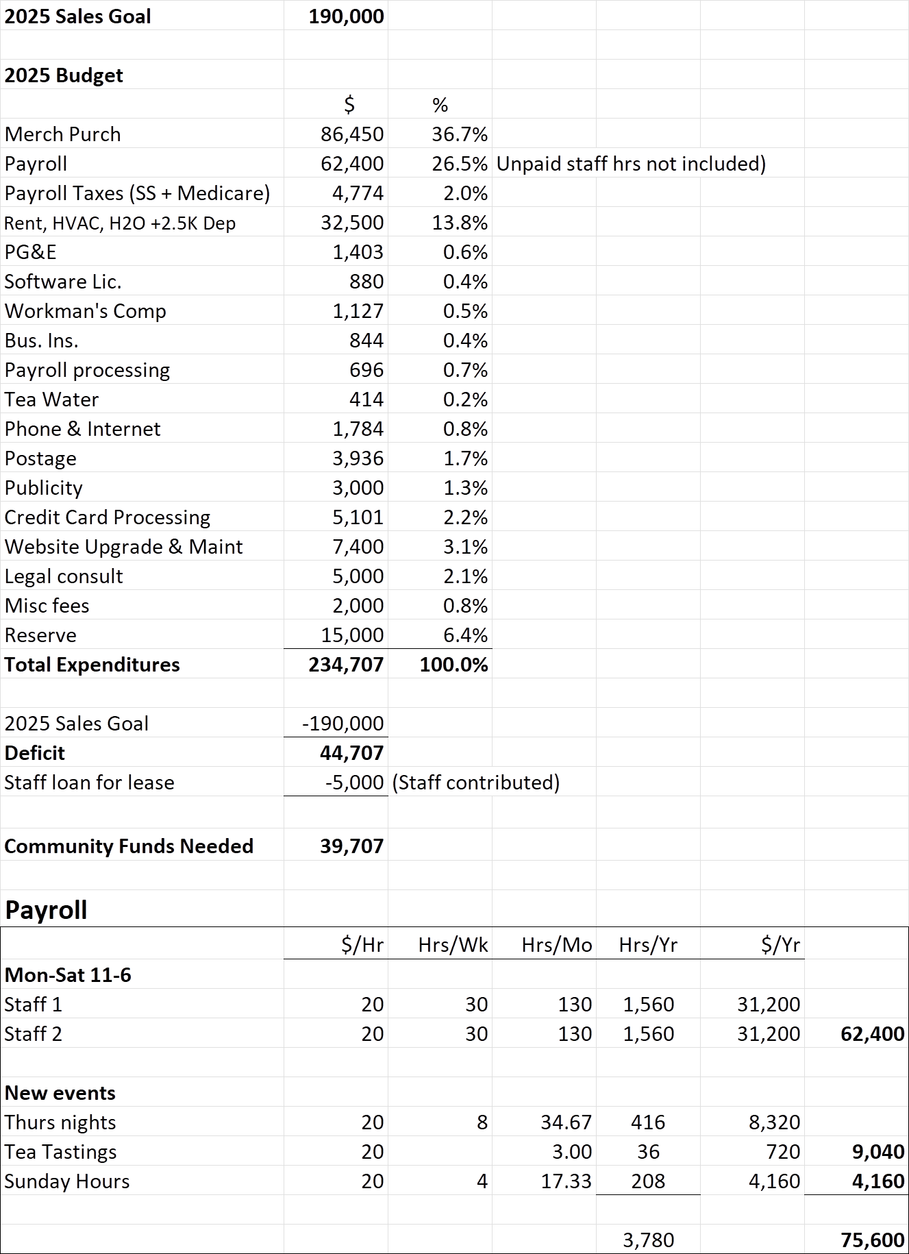 The budget and staffing plan for 2025 shows a potential 2025 operating deficit of $40K after contributions by Frederick and Kallenbach through a loan of ~$5K to secure the initial month’s rent and deposit), and ~$15K in the value of unpaid staff hours and associated taxes for the hours to support Thursday night events (weekly), monthly tea tastings, and Sunday afternoon sales hours.